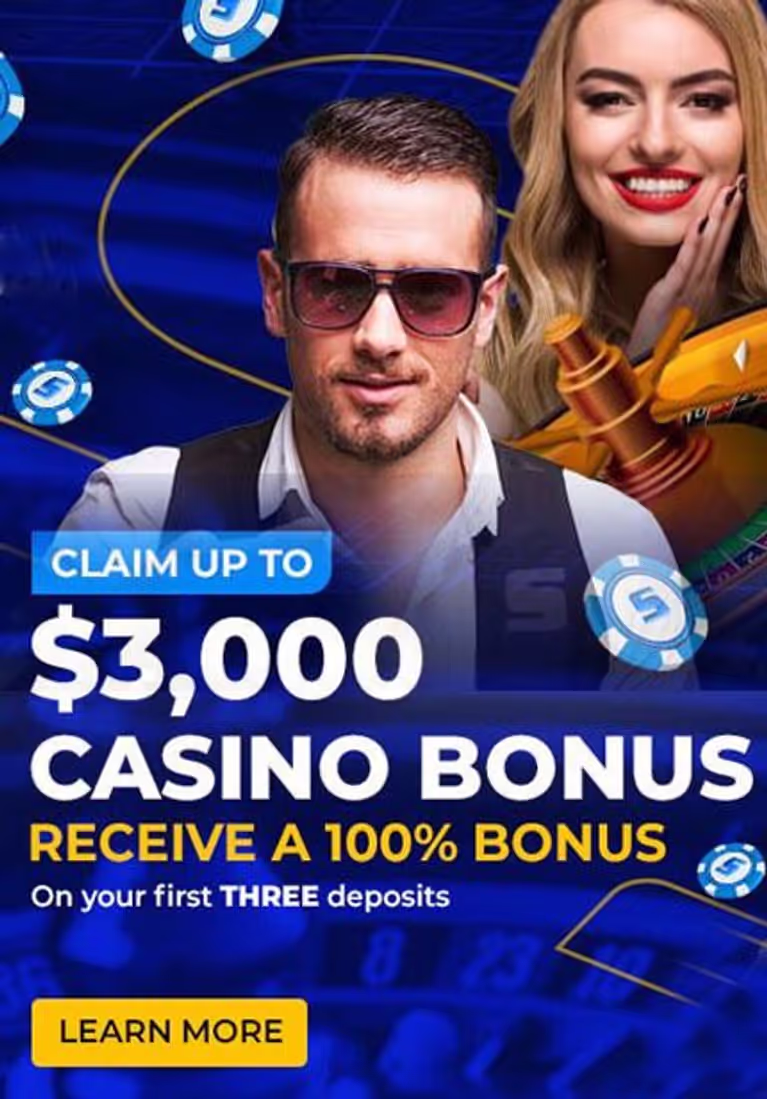 Additionally, use code SBCASINO for a 100% match up to $1,000 on each of the first three deposits (total up to $3,000), with 45x wagering on all games, valid 30 days.